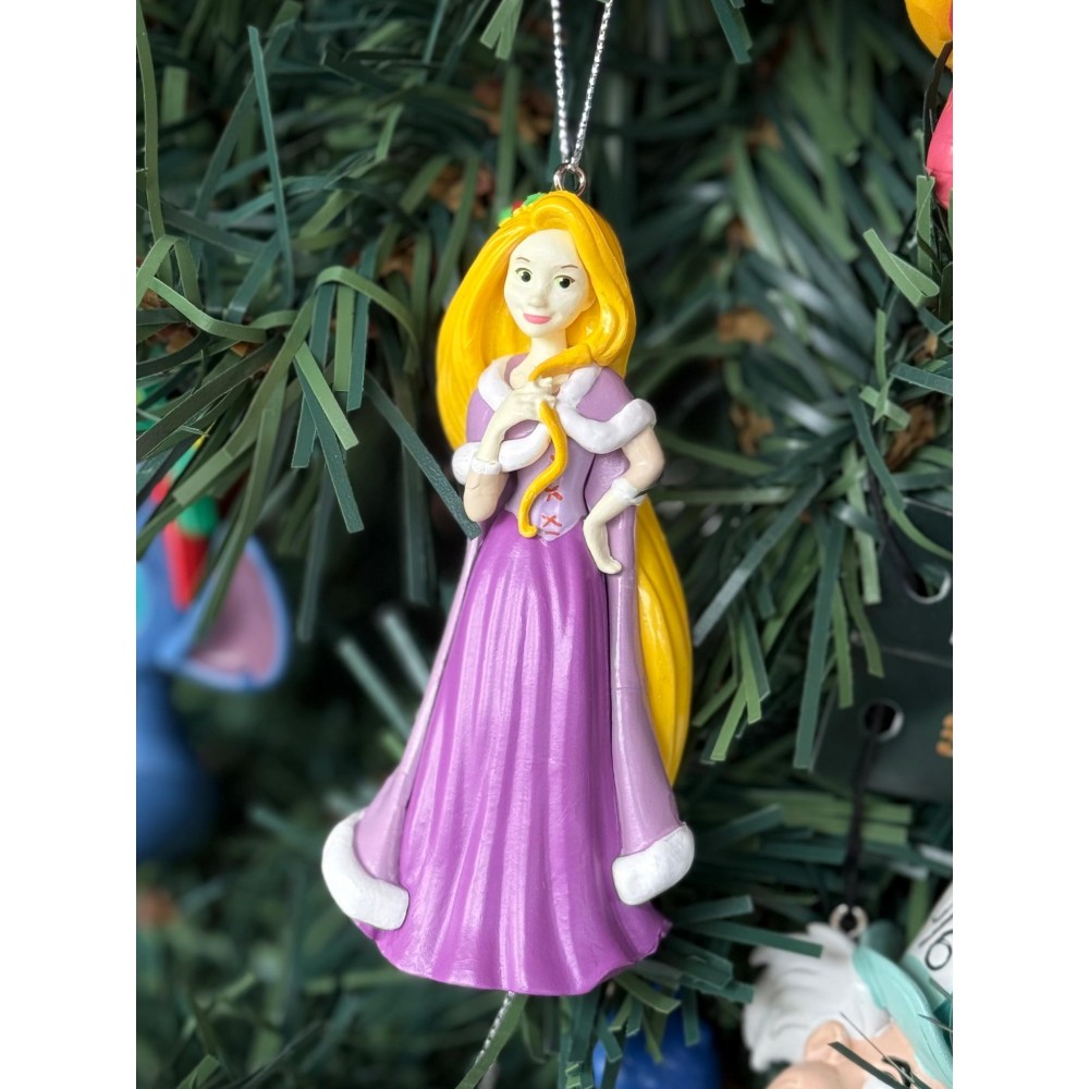 Decorazione natalizia da appendere raffigurante Rapunzel, con abito lilla e lunghi capelli dorati. Perfetta per bambine e collezionisti Disney, dona al tuo albero un tocco fiabesco e luminoso.