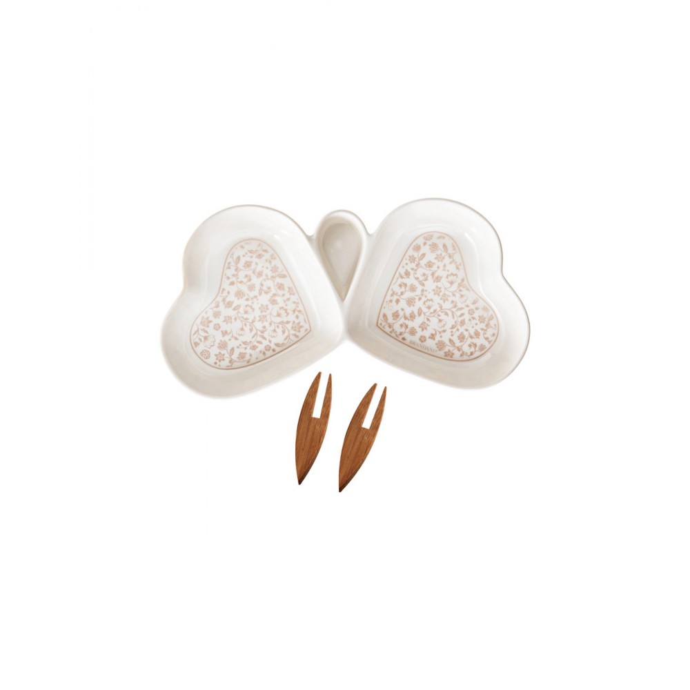 Antipastiera in porcellana con doppio scomparto a cuore e forchettine in bamboo, collezione “Campo ai Fiori”, dallo stile romantico e delicato.