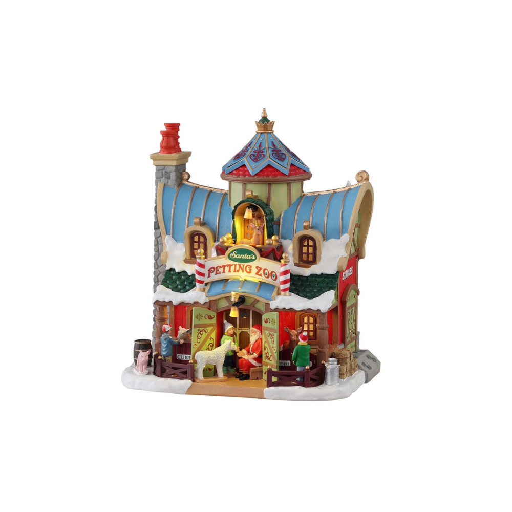 Villaggio di natale Lemax. Santa's Petting zoo rappresenta uno zoo natalizio, con a capo Babbo Natale che si prende cura degli adorabili animali. Una caratteristica è la calda luce che riflette all'interno, per donare maggiore atmosfera.