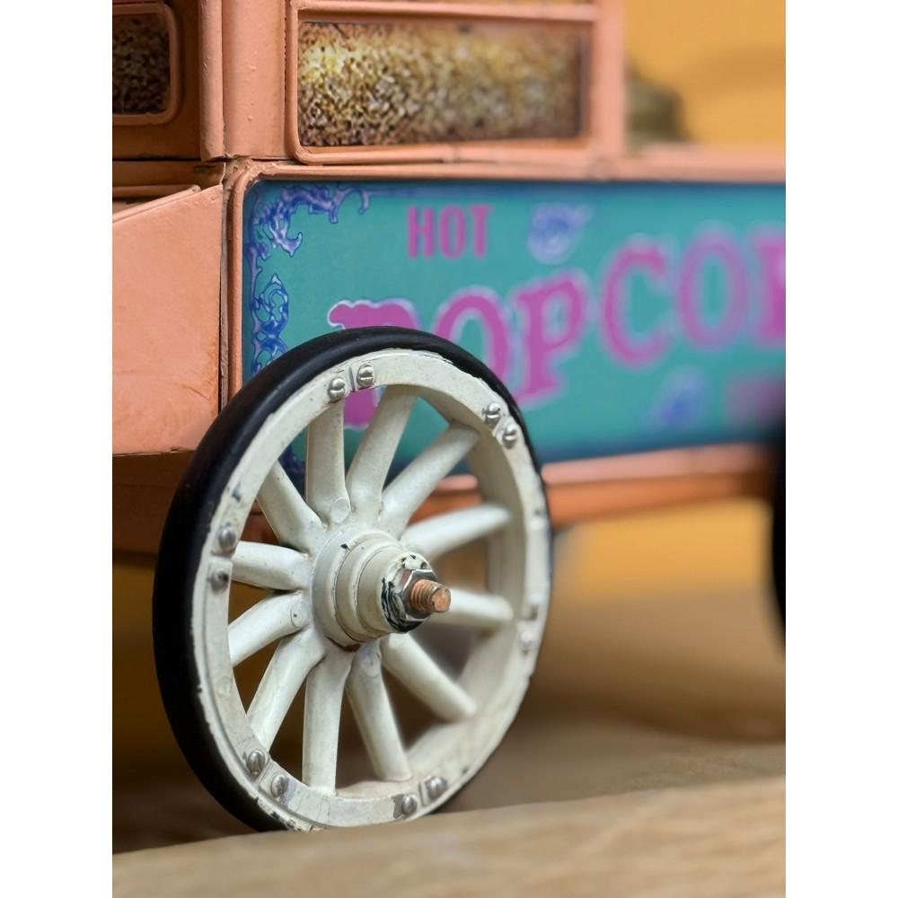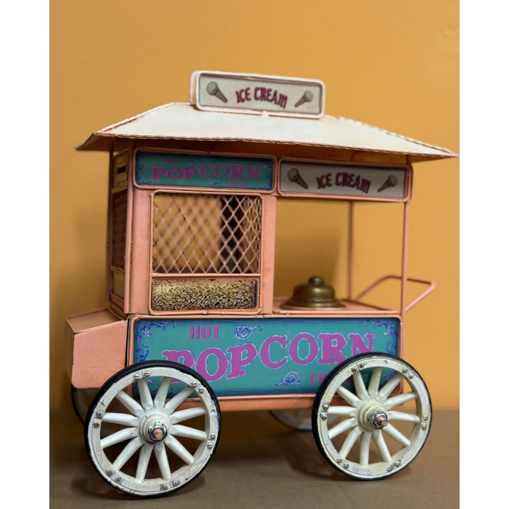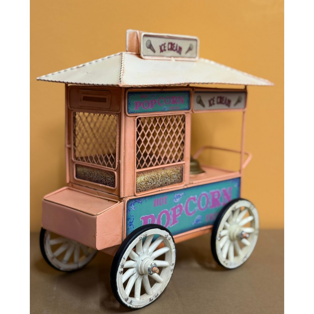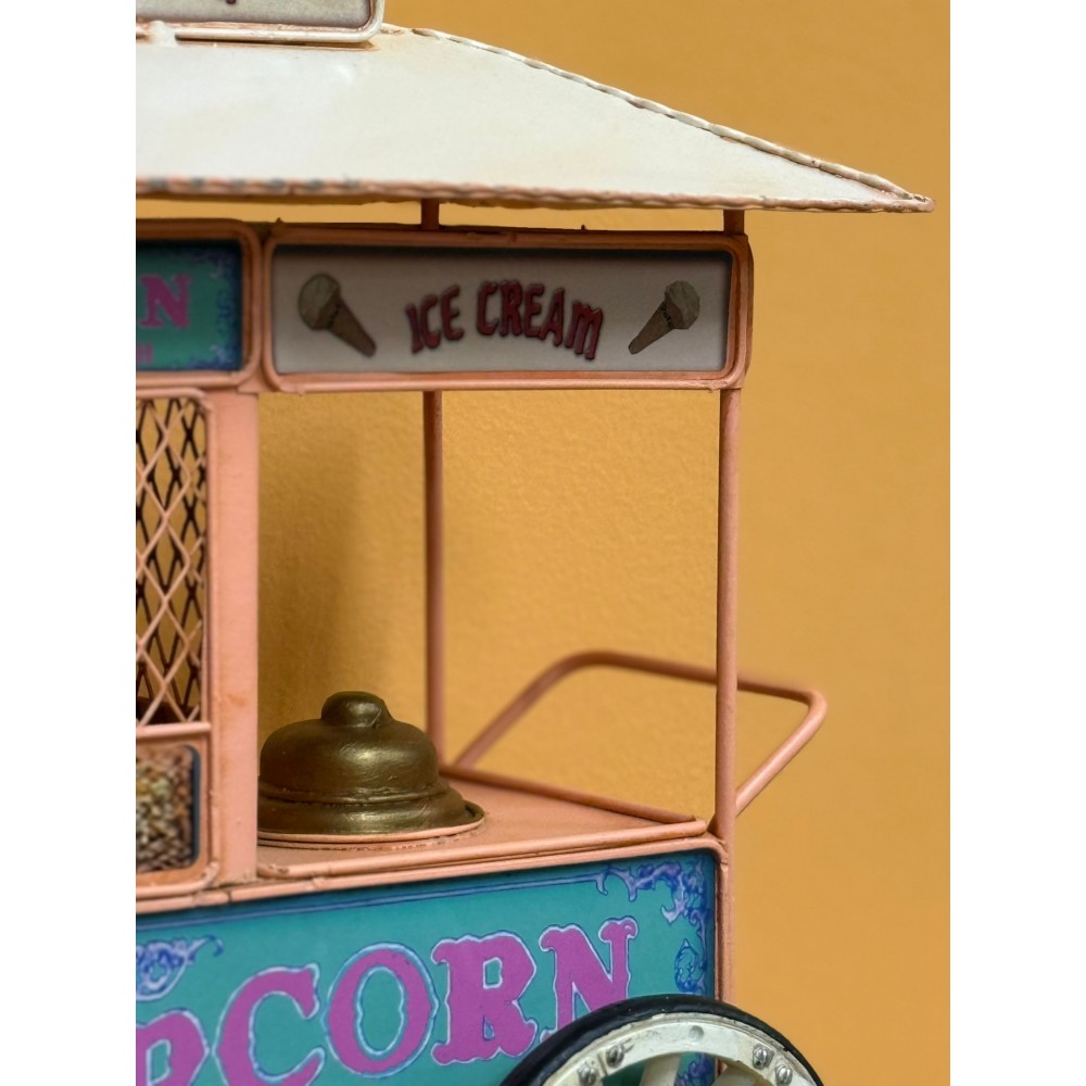 Un tuffo nell’atmosfera delle fiere e dei parchi divertimento di una volta: questo carretto in latta riproduce fedelmente un piccolo chiosco ambulante dedicato a gelati e pop corn. Con i suoi colori pastello, le grandi ruote bianche e le insegne rétro, è un pezzo unico che richiama la spensieratezza dei tempi passati. Perfetto come oggetto decorativo per cucina, taverna, negozio o collezioni a tema vintage, aggiunge un tocco allegro e nostalgico all’ambiente. È anche una splendida idea regalo per gli amanti dello stile retrò e delle miniature artigianali.