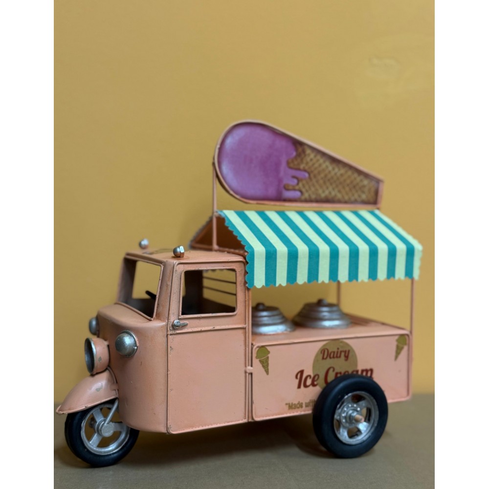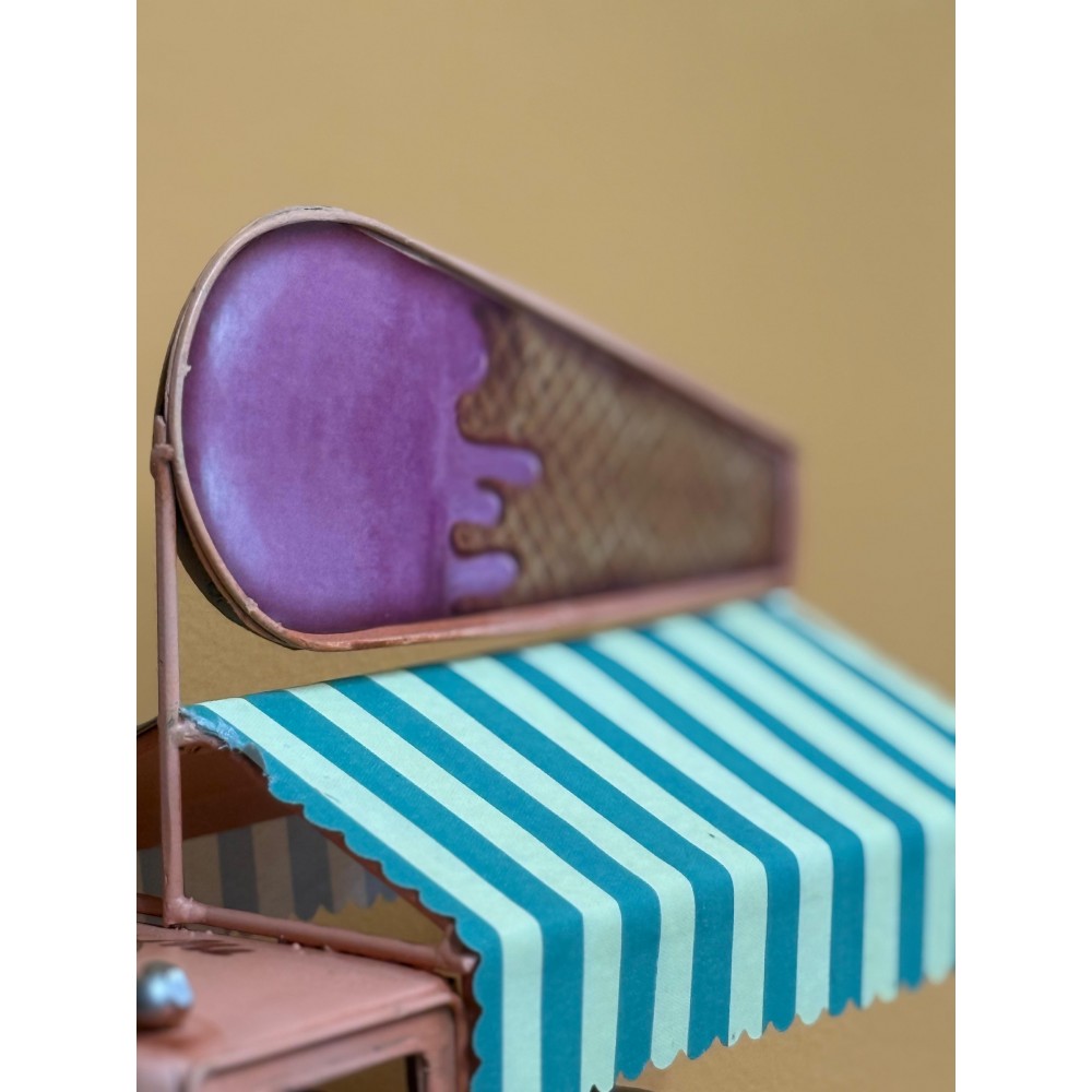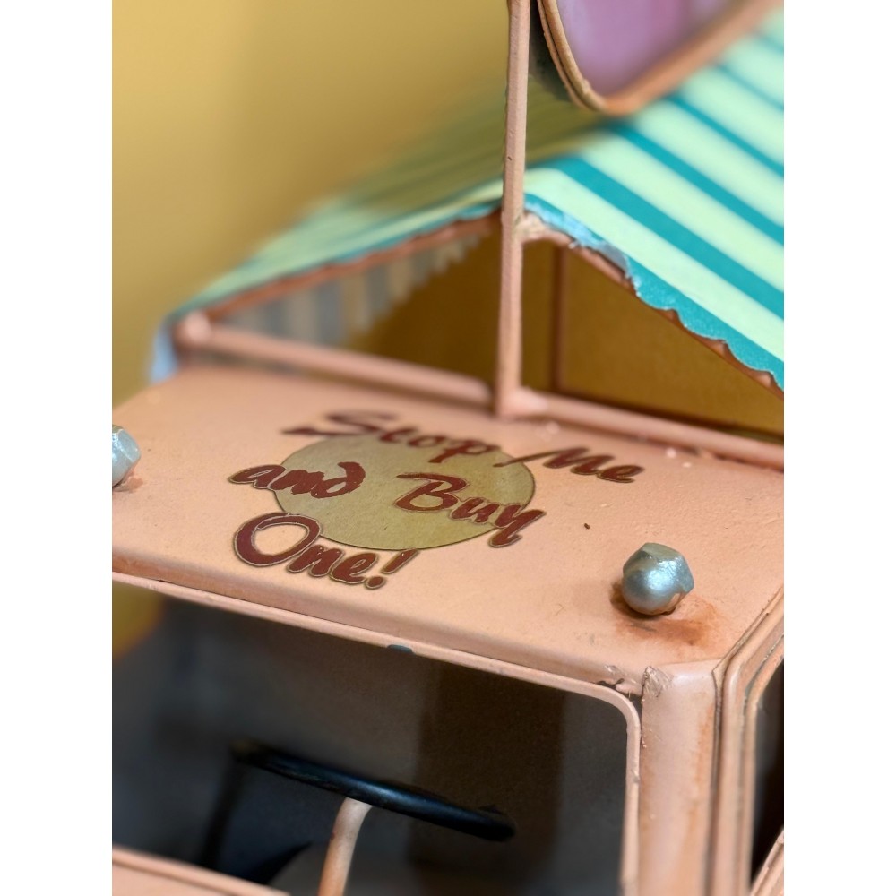 Un delizioso modello in latta che richiama l’atmosfera estiva dei carretti ambulanti di una volta: questo camioncino gelati in stile retrò è realizzato con cura artigianale e decorato con dettagli che lo rendono unico, come il grande cono gelato sul tetto e il tendalino a righe verdi e gialle. La struttura compatta e i colori pastello gli conferiscono un fascino nostalgico che riporta immediatamente alle giornate spensierate al mare o alle feste di paese. Perfetto come decorazione per casa, cucina, taverna o negozi a tema vintage, è anche un’idea regalo originale per collezionisti e amanti delle atmosfere retrò.
