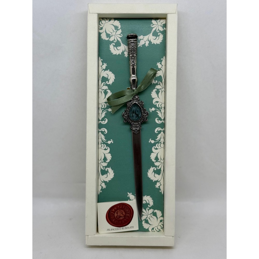Tagliacarte Verde Acqua in metallo decorato con cristallo Swarovski®, confezionato in elegante scatola. Perfetto come dono raffinato o idea regalo per lauree e occasioni speciali.