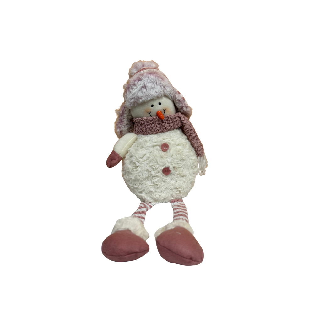 Pupazzo di neve in stoffa con cappello e sciarpa grigio a righe, corpo morbido effetto peluche e gambe pendenti. Un decoro allegro e tenero, perfetto per abbellire mensole, tavoli o camini durante le feste.