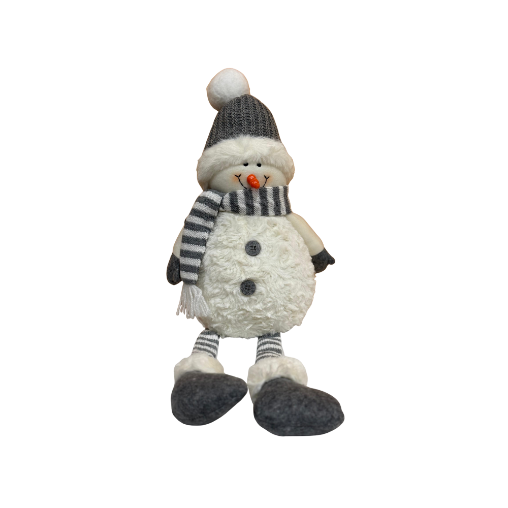 Dolce pupazzo di neve in stoffa con cappello e sciarpa rosa, dettagli in pelliccia e gambe morbide pendenti. Perfetto per decorare mensole, tavoli o camini e portare un tocco tenero e invernale alla casa.